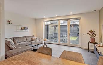 Middels een grote pui met veel glas loopt de woonkamer in de tuin over..